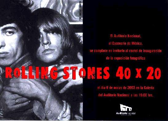 Luego de haber generado gran interés de críticos y admiradores de "Sus satánicas majestades" en su exposición pública el año pasado en Washington y Nueva York, la muestra fotográfica Rolling Stones 40 X 20 se presentará en la galería del vestíbulo del Auditorio Nacional, del 6 de marzo al 31 de mayo del 2003.
