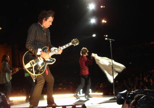 Musically, they sounded really good. Keith made a bit of a botch of the first part of the solo in 'Rough Justice' - Roadster and I shot ourselves a quick look that said "Eek!" but things soon recovered. His solo in 'Sympathy' was pretty short and ragged, but the song picked up and the latter part of it was pretty glorious. At one point, Mick missed a cue, sang in a place where he wasnt supposed to and Keith looked around in bewilderment with this pricless expression which seemed to say "Jagger - what the fuck ARE you doing?". Otherwise Keith seemed sharp enough. You kinda knew it was gonna be a good night when he absolutely bounded onstage, hit that first chord of 'Start Me Up', kicked his leg in the air and the crowd went absolutely nuts. He came out to both catwalks at various points, got down on his knee to the crowd when playing his solo on 'Tumbling Dice - generally he seemed to be moving around quite well.